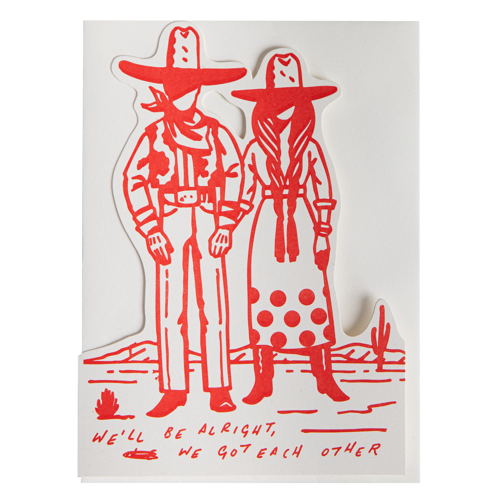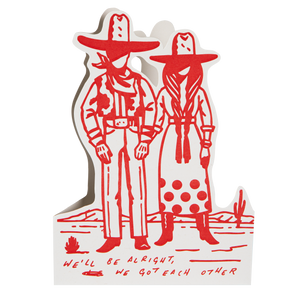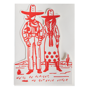 Our letterpress cut-out card featuring a red outline of a cowboy couple and the words 'We'll be alright if we have got each other.'