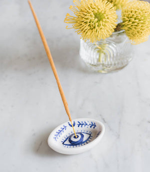 The Lalita Evil Eye Incense Holder features the famous hand painting of the blue pottery artisans of Jaipur. This work of master artisans has been passed down from generation to generation. This is an intricate traditional artform which is applied to modern design bringing age old talismans like the evil eye to life in beautiful, functional ways. This incense burner features one hole and is small enough for a space on a desk or altar or to accompany a bath-time, self-care ritual. It is compact enough to take along on travels and makes an easy gift for a incense lover, especially as part of a larger self-care, pampering gift set with a candle and a mug for example.