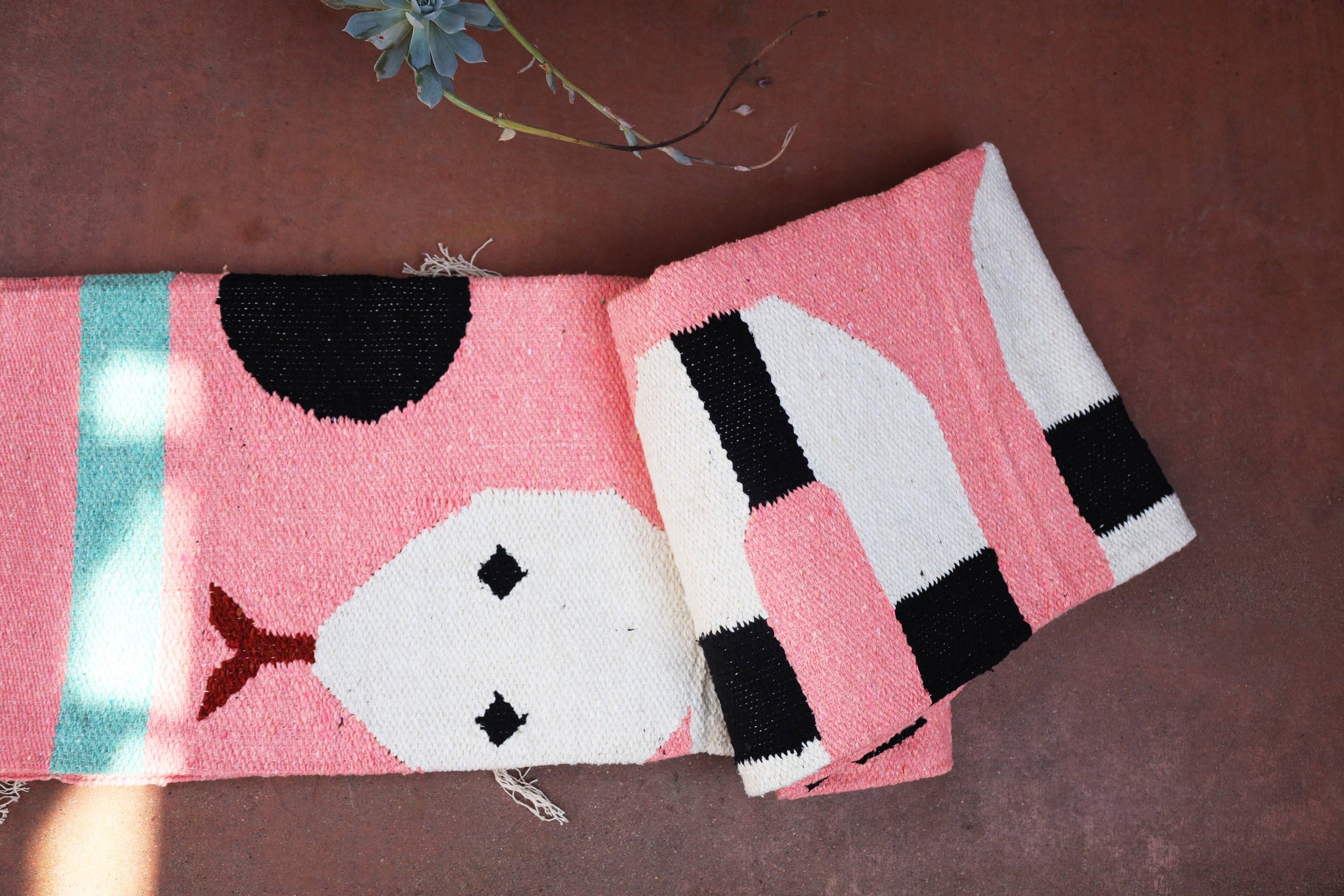 Crafted by Master Weaver Josafat y Nahim Nava, Mexico -Eco-Friendly Materials: Crafted from 100% post-consumer materials, this special blend of cotton, acrylic, and polyester not only ensures durability and softness but also supports sustainable practices. Dimensions & Versatility: -Measures approx. 79" x 48" -Weighs approx. 3-4 lbs Pe