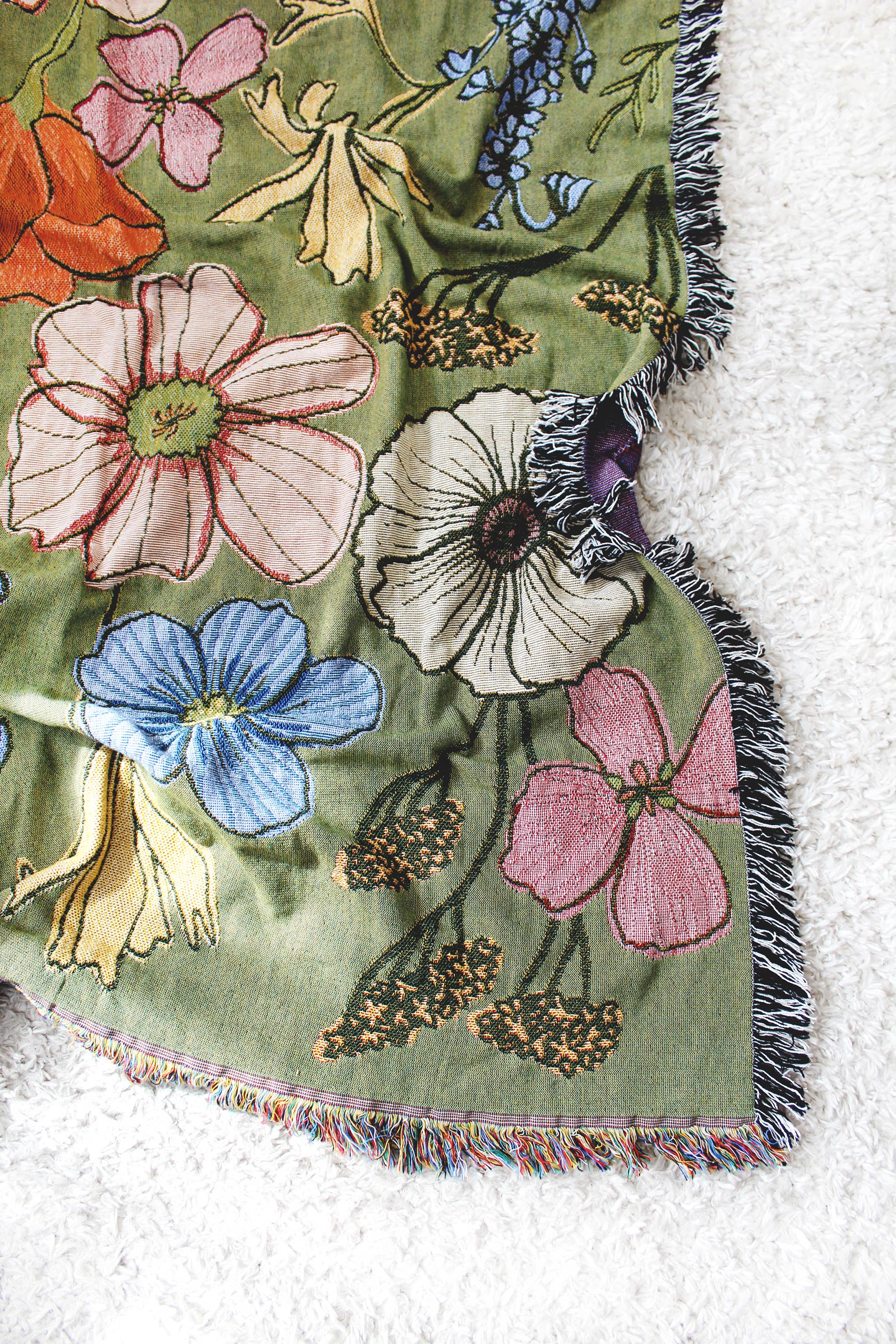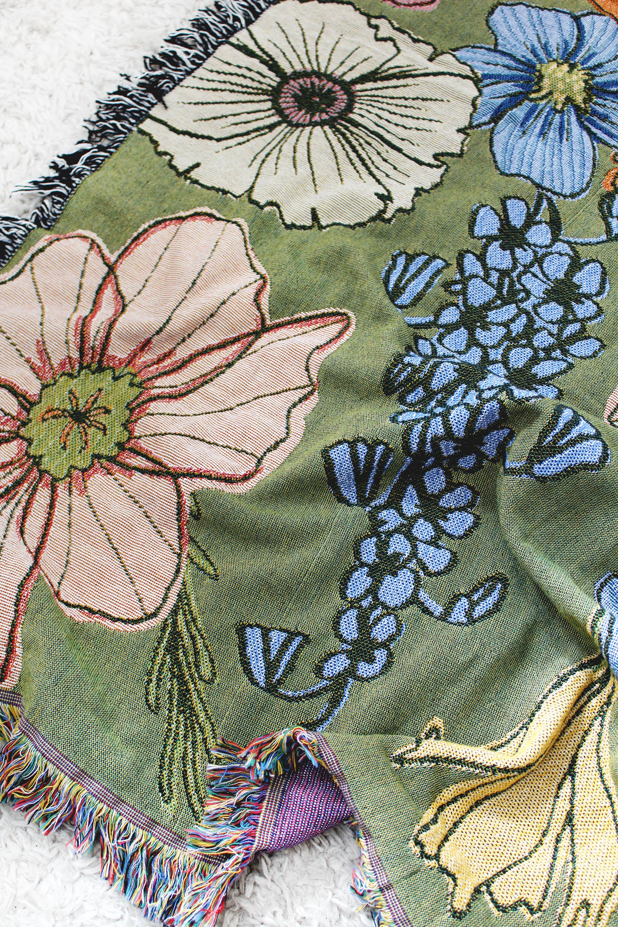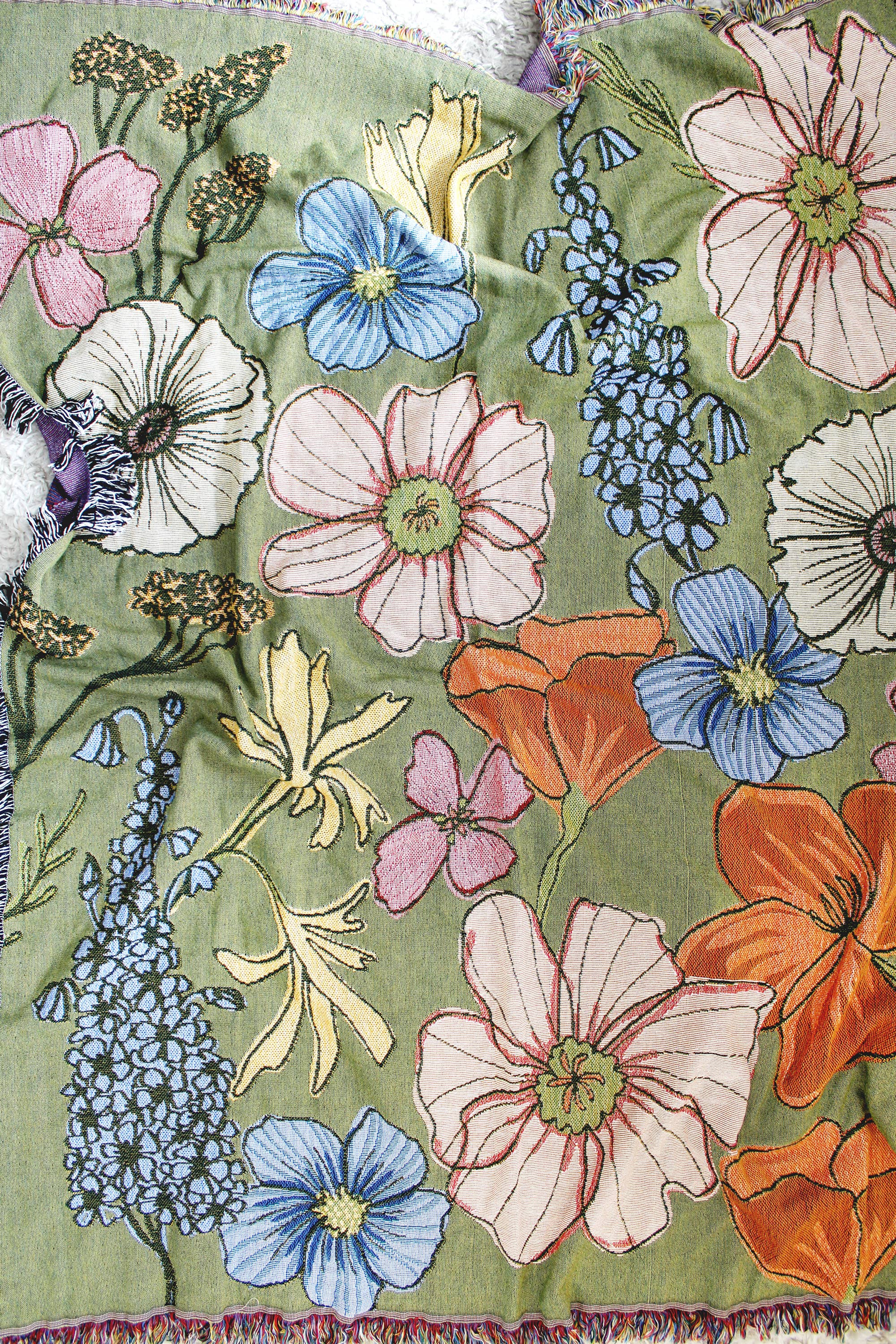 Our Wild flowers tapestry blanket showcases colorful and delicate florals found in Mother Nature on an olive green background.