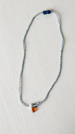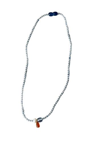 This handmade necklace is crafted with care using a curated selection of vintage and thrifted materials. It features vintage glass and shell beads and a glass pendant