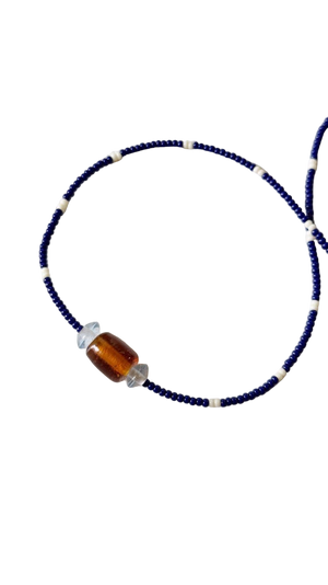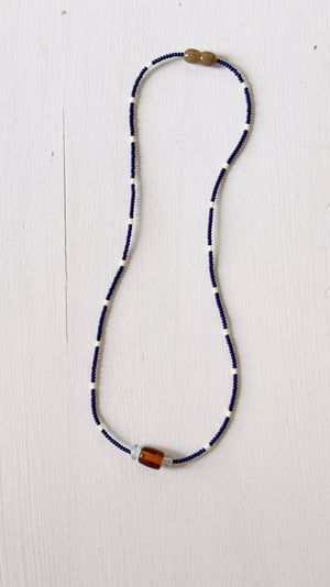 This handmade necklace is crafted with care using a curated selection of vintage and thrifted materials. It features seed beads, stone and glass beads