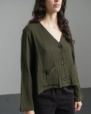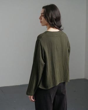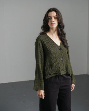 Boxy, cropped, blue denim blouse. Our take on a classic shirt. This 100% cotton blouse is a bestselling style. Pair with trousers or a skirt. Made in heavy-weight denim for extra warmth. Shirt collar. Full length sleeves with buttoned cuffs. Contrast imitation shell buttons. Two large front pockets. Back yoke with full gathers for shape.