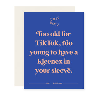 Reads "Too old for TikTok, too young for a Kleenex in your sleeve. // Happy Birthday"