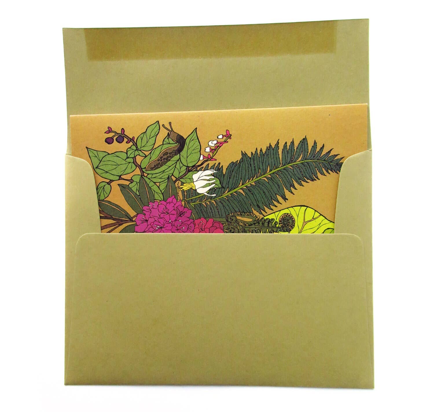 A collection of wildflowers and plants local to the pacific northwest. Including great big rhododendrons, blackberries, ferns, skunk cabbage, fawn lily, salal and a slimy slug. Details: - Blank on the inside - 4.25 x 5.5 inches - Recycled paper card and envelope - Biodegradable plastic sleeve