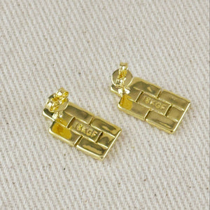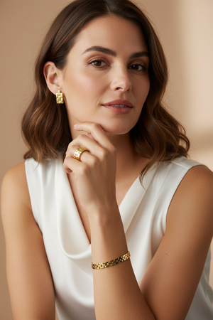 Sophisticated drop earrings in 18k gold filled featuring an elegant watch band-inspired design with segmented rectangular links. The structured, architectural pattern creates luxurious texture and dimension that catches the light beautifully. A modern statement piece that elevates any look with timeless, refined style.