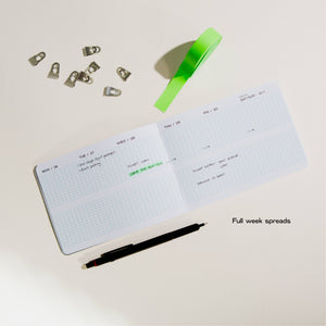 A compact A6 planner designed for people who love structure and good design. Includes monthly and weekly spreads, habit tracking, and durable paper that holds ink beautifully. Finished with a premium speckled foil-stamped cover and a PVC protective sleeve to withstand a full year of daily use. Simple, functional, and made to last. Dates: January - December 2026. ✶ ☺︎ ☞ DETAILS + Dates: January 2026 - December 2026 + Comes with a premium removable PVC cover + Layflat smyth-sewn binding + Size: 4x6 inches MATERIALS + Enjoy a smooth writing experience on 80lb uncoated paper that resists ink bleed-through, ensuring your writing stays clean and sharp. + Perfect for both pens and pencils. + Thick cover paper in speckled black and stamped silver text.
