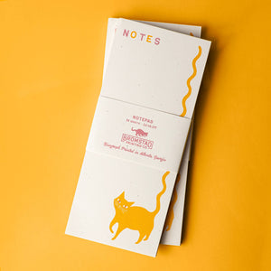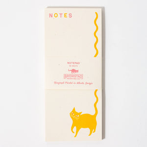 Notepads! A playful kitty with a wavy, wiggly, squiggle tail can barely contain their excitement at the thought of jotting down notes on this tall notepad! Featuring the word "NOTES" at the top in alternating colors and 52 tear-off sheets on a chipboard backer. Risograph printed in light mauve pink and sunflower yellow.