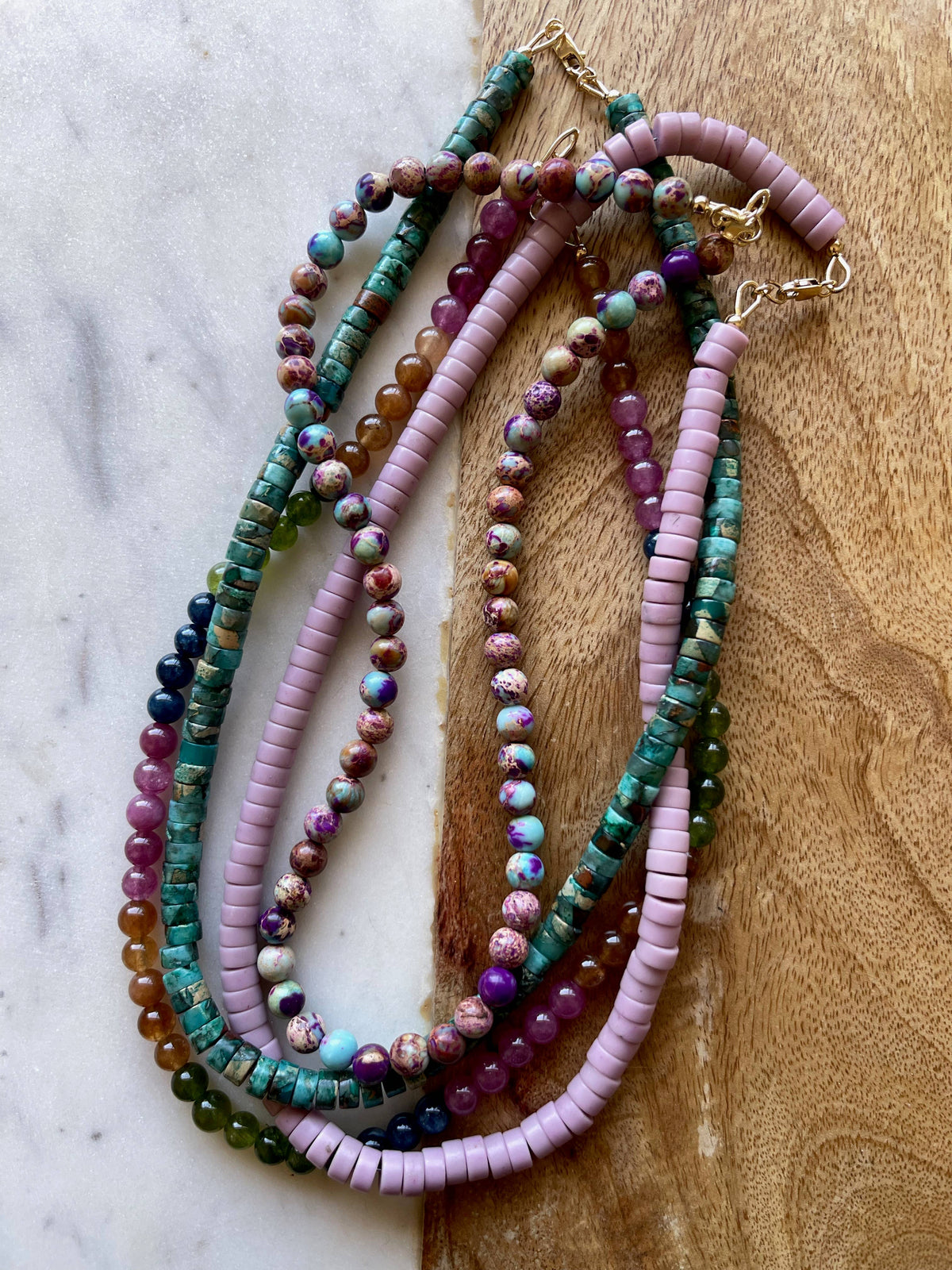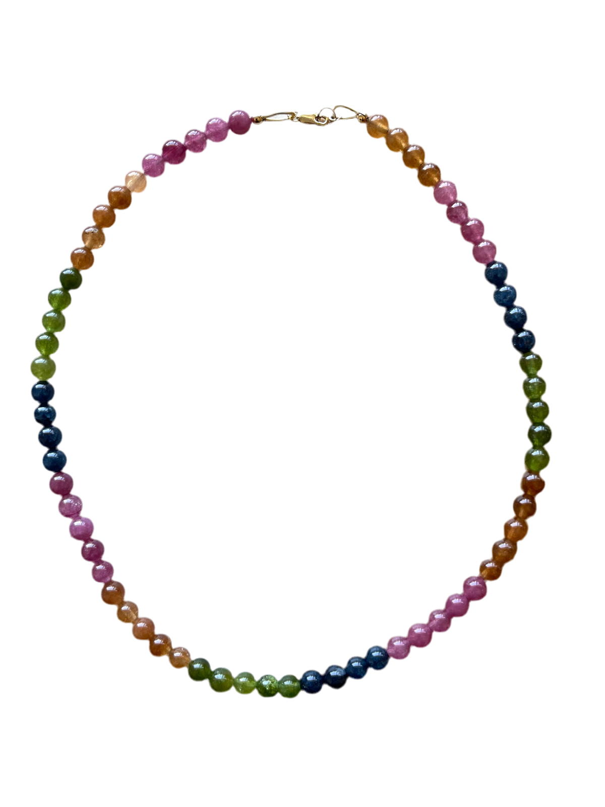 Hand beaded multi colored jade beaded necklace, with 14k gold filled findings. Total length 16". Looks great alone, but even better layered with your favorite chains!