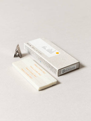 From the pioneers of fragrance behind our bestselling HA KO collection comes Washi Paper Incense Strips, a new type of incense combining friendly missives with rich aromas. Each box contains 30 strips of incense steeped in a blend of natural aromas carefully combined to create a specific scent, along with a metal clip to hold the incense as it burns.